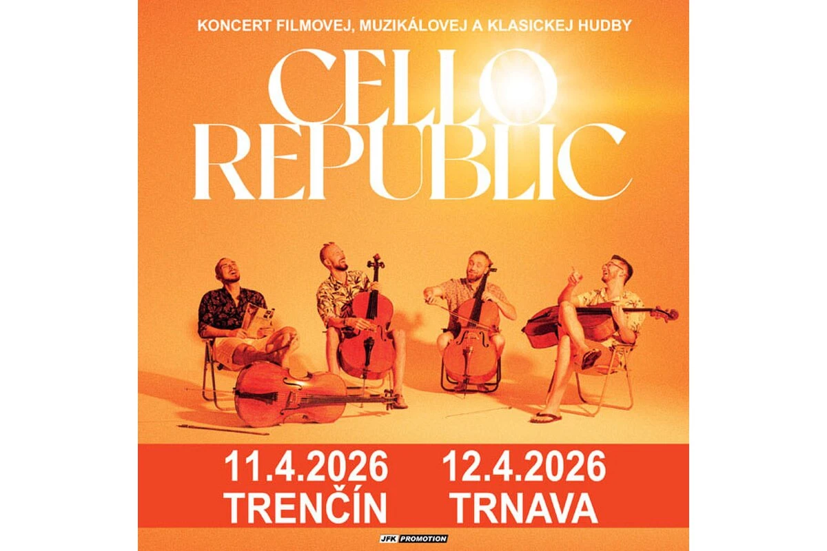 Večer o 19. hodine zaznie v Kine Hviezda v Trnave flmová, klasická a muzikálová hudba v podaní jedinečnej štvorice hudobníkov Cello Republic. Skupina violončelistov, víťazov medzinárodných súťaží, popularizátorov klasickej hudby, sa preslávila u nás, vo svete, na YouTube a kdekoľvek vkročila. Necháva za sebou vypredané sály, originálne zážitky z koncertov a milióny zhliadnutí.
