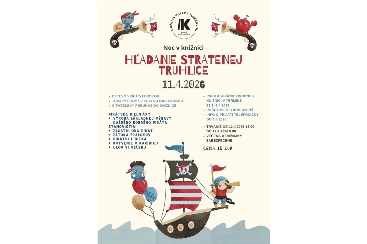 Dobrodružnú noc s témou Hľadanie stratenej truhlice si pre deti vo veku 7 až 11 rokov pripravila miestna knižnica v Suchej nad Parnou. Podujatie plné hier, tvorivých aktivít a pirátskej atmosféry začne v sobotu 11. apríla o 18. hodine a potrvá do nasledujúceho dňa, do 8. hodiny rannej.