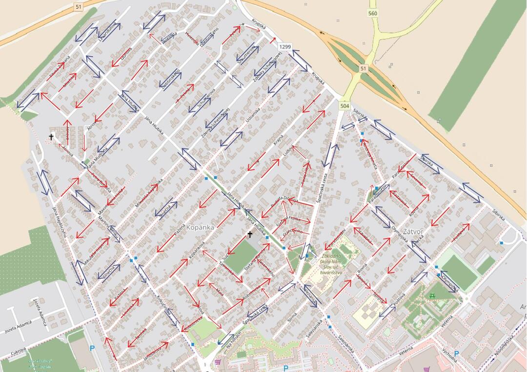 Ulice, ktoré budú po novom prejazdné len v jednom smere, sú vyznačené na mape. Červená šípka znázorňuje jednosmerný prejazd a modrá obojsmerný. V týchto lokalitách je doprava aktuálne regulovaná vodorovným dopravným značením a postupne sa inštaluje aj zvislé dopravné značenie.