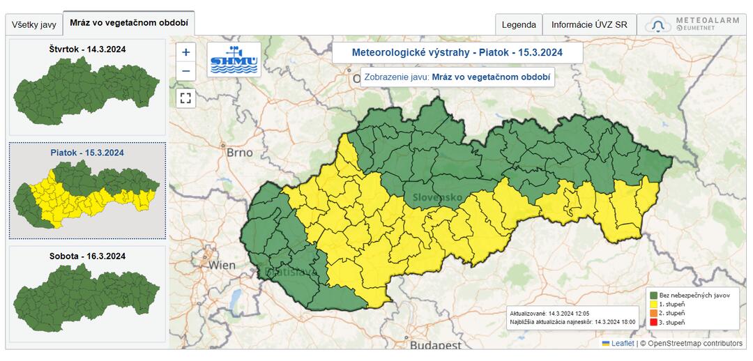 Výstraha platí pre päť krajov Slovenska, výnimkou sú len okresy v Bratislavskom, Prešovskom a Žilinskom kraji. Pokiaľ ide o Trnavský kraj, prízemné mrazy majú zasiahnuť okresy Piešťany a Hlohovec.