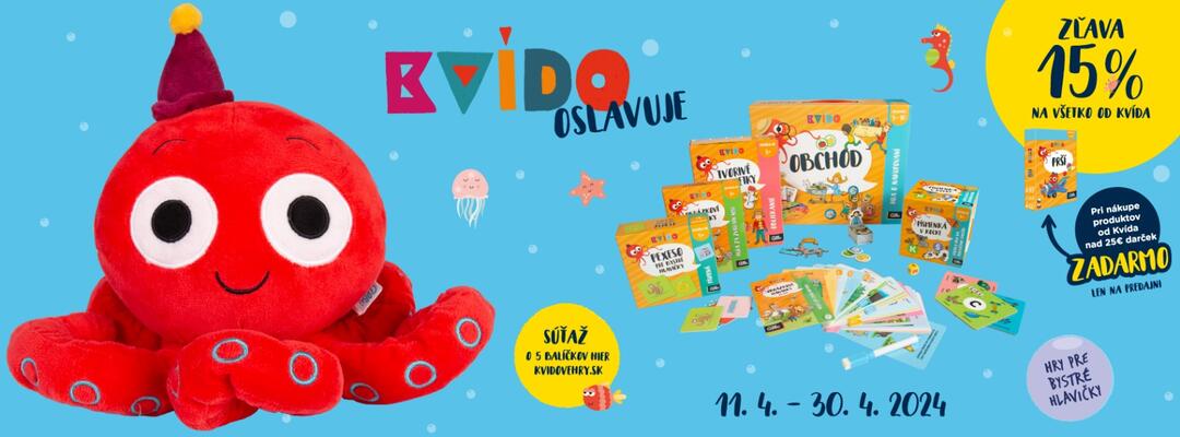 Zapojte sa do súťaže o jeden z 5 balíčkov Kvídových hier v hodnote viac ako 50 EUR. Kliknite na web Kvidovehry.sk, stiahnite si jednu z troch súťažných PDF aktivít, zahrajte sa ju spolu a napíšte nám ako vás hra bavila. Pridať môžete i fotografiu z hrania. E-mail s predmetom KVÍDOVE OSLAVY pošlite do 30. apríla na kvido@albi.sk, piatich z vás odmeníme balíčkom Kvídových hier.
