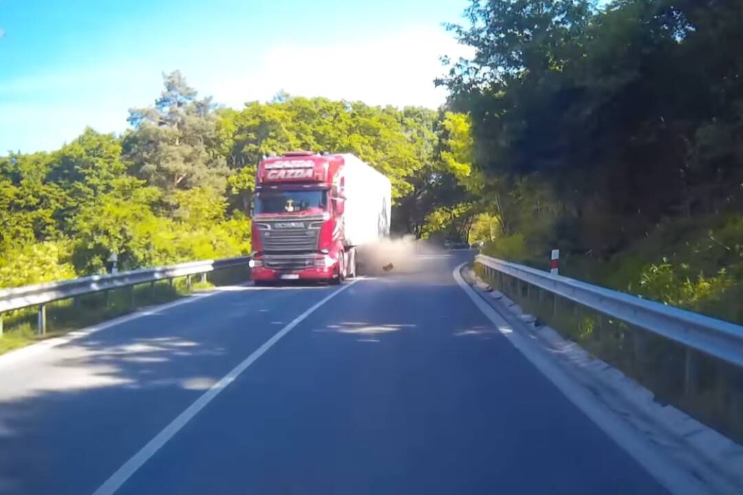 Na zábere videa je pritom vidieť, ako sa z protiidúceho nákladného auta uvoľnil zakladací klin a prebehol vodičke pred autom mimo cestu. Skutočne tak mala šťastie, že sa nič vážne nestalo.