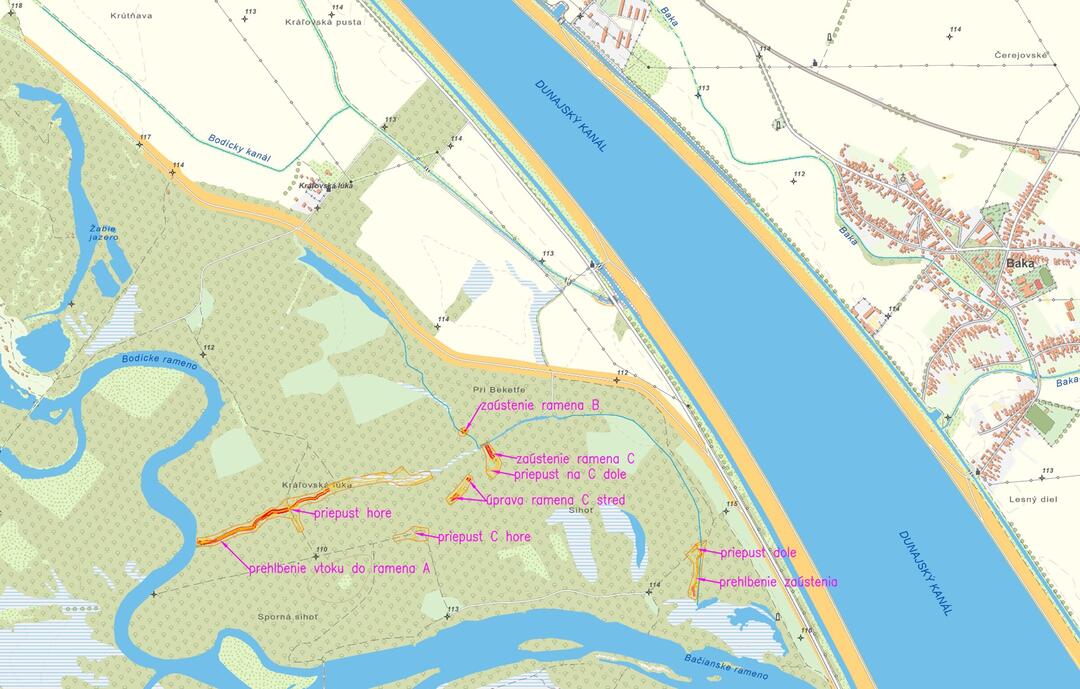 „Aktuálne už bagre pracujú na zmene tohto stavu, sprietočnení celého ramena (A) a dvoch reliktoch menších ramien (B a C), ktoré napájajú aj priľahlé mokrade. Fyzicky bude prekopaných zhruba 1,1 km, ktoré ovplyvnia vodný režim na 4,4 km ramien a napoja významné mokrade v celej oblasti. Okrem toho vyriešime ešte 2 veľké križovania s cestou , kde budú namiesto upchávajúcich sa rúr osadené rámové priepusty a 2 miesta v oblasti menších križovaní bočných ramien s cestami, kde zase osadíme rúry,“ informuje na sociálnej siti BROZ - ochranárske združenie. Výsledkom týchto úprav bude to, aby sa voda vrátila tam, kde jej v minulosti prehradili cestu. Spolu s vodou by sa mal do starého riečneho ramena vrátiť aj bohatší a rôznorodejší život.
