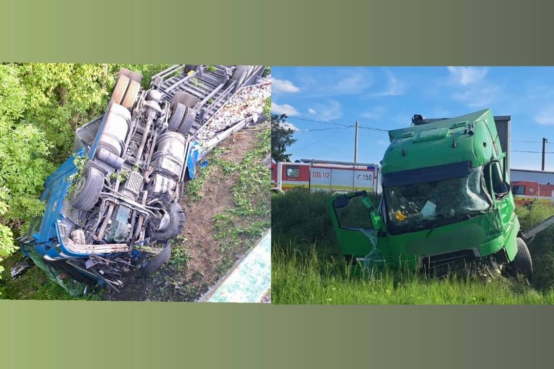 FOTO: Dve nehody kamiónov. Jeden sa zrazil s vlakom, druhý skončil v priekope