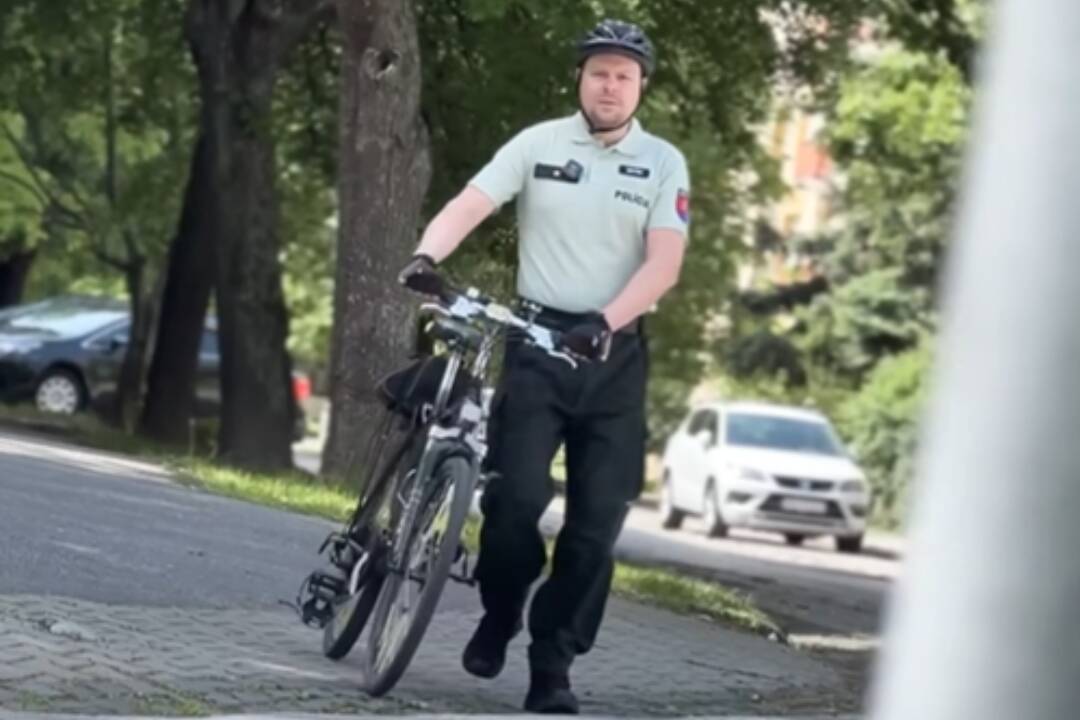 Buď na bicykli cyklista, nie egoista: Ako prechádza cyklista cez priechod pre chodcov!? Toto je popis k videu, ktoré zdieľali. V ňom policajt počas jazdy na bicykli pred priechodom pre chodcov zosadol z bicykla a tlačil ho vedľa seba, kým neprešiel na druhú stranu cesty. Následne tiež ukázal, ako sa cez priechod na bicykli jazdiť nemá, pričom v tomto prípade z bicykla nezosadol a v jazde na ňom pokračovala aj cez priechod pre chodcov.