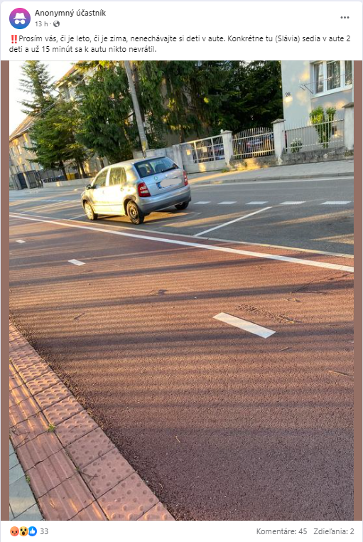 „Prosím vás, či je leto, či je zima, nenechávajte si deti v aute. Konkrétne tu (Slávia) sedia v aute 2 deti a už 15 minút sa k autu nikto nevrátil,“ napísal v príspevku, v ktorom uverejnil aj fotografiu auta, v ktorom deti sedeli.