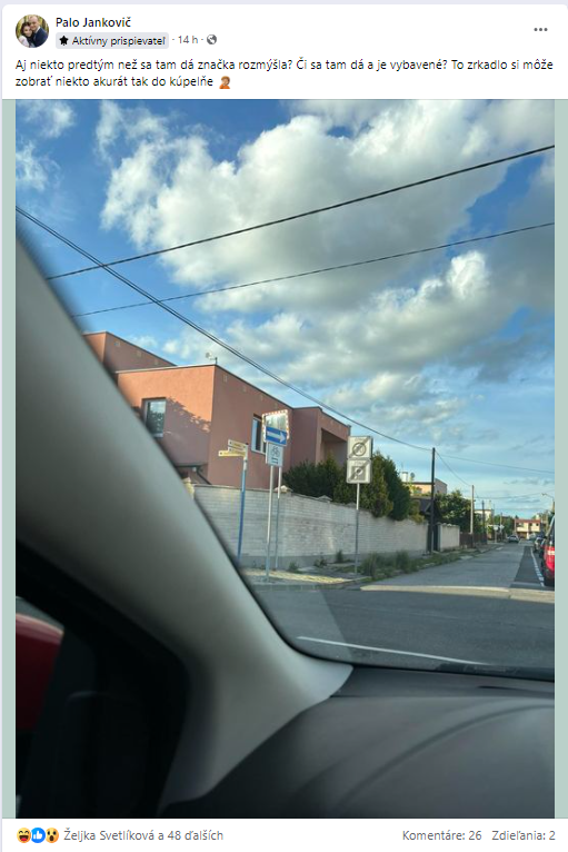 „Každý deň sama špecialita z Trnavy. Ja už neviem čo čakať,“ napísal pod príspevok Erik. „Jedno zrkadlo hore dole. O dve uličky ďalej na poštovej veselo jazdia do protismeru každý deň,“ komentoval Erik. „Nebolo by lepšie z Trnavy spraviť jeden vstup a jeden výstup a hotovo?“ napísal ironicky Tomas.