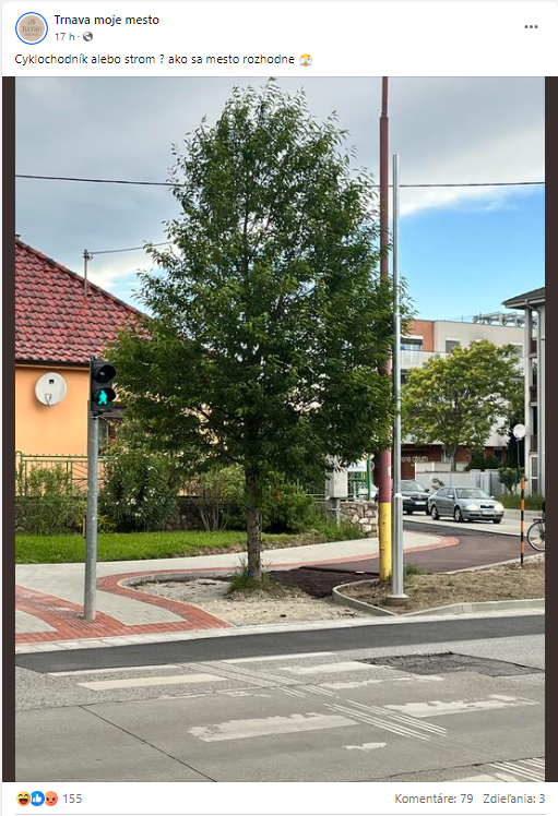 Príspevok komentovalo množstvo ľudí, ktorí sú jednoznačne za to, aby tam strom zostal. „Ja tam žiadny problém nevidím... strom tam môže kľudne zostať, cyklista ho nemá problém obísť, miesta je tam dosť. Možno to tak aj plánujú, inak by ho už určite dali preč skôr,“ napísal Dušan. „Strom, je dôležitejší ako cyklochodník. Nech tam ten strom nechajú veď sa dá s bicyklom obísť,“ komentovala Soňa. „A keď bude čakať na zelenú môže sa ho držať a nebude musieť zosadnúť!“ uviedol Martin.