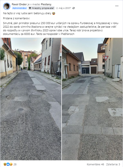 Podľa komentárov to však nie je jediná ulica, ktorú si obyvatelia opravujú sami. „Aj my si lepíme na vlastnej ulici diery, to je také Piešťanské, bohužiaľ nikto to za nás nespraví, nechcem stratiť koleso, alebo náklad,“ napísal Lukáš. „Najlepšie sú staré Piešťany keď idem domov z mesta, viezol som deti a chlapcovi čo ma kinetózu dostal morskú nemoc,“ uviedol Matej. „Hviezdoslavova ulica dtto... ozaj, zaujímalo by ma koľko Piešťancov využíva zimný štadión?“ napísal užívateľ Joe.