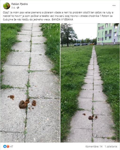 „Ozaj? Ja mám psa veľké plemeno a zbieram všade, a nie je problém otočiť ten sáčok na ruby a nabrať to hovn* ja som psičkár a takéto veci ma serú, ozaj hovno v strede chodníka? Potom sa čudujme že nás hádžu do jedného vreca,“ napísal v príspevku Fabian.