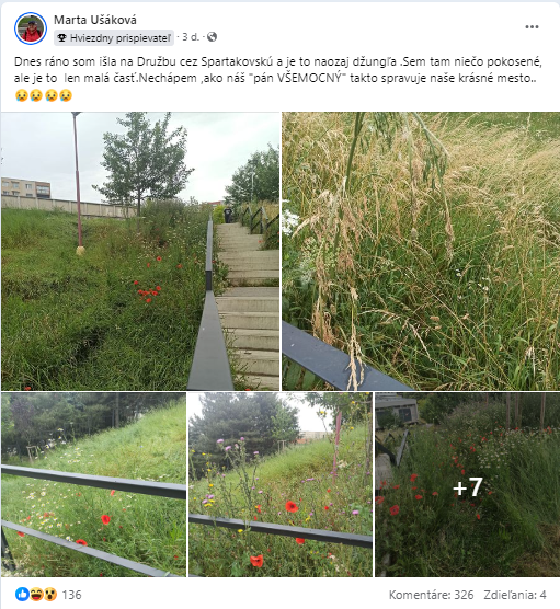 „Dnes ráno som išla na Družbu cez Spartakovskú a je to naozaj džungľa. Sem tam niečo pokosené, ale je to len malá časť. Nechápem, ako náš „pán VŠEMOCNÝ“ takto spravuje naše krásne mesto,“ uviedla v príspevku.