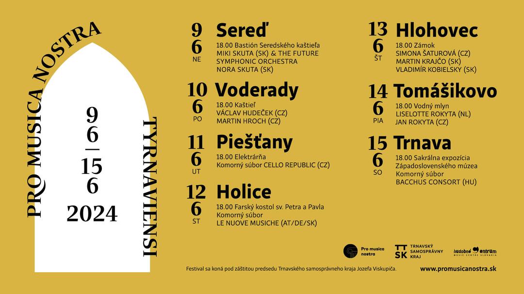 Aj tento rok zavíta festival klasickej hudby Pro musica nostra do Trnavského kraja. Od 9. do 15. júna si môžete vychutnať zážitok z obdivovania architektonických pokladov Slovenska doplnený o pestrý hudobný program, uvádza TTSK.