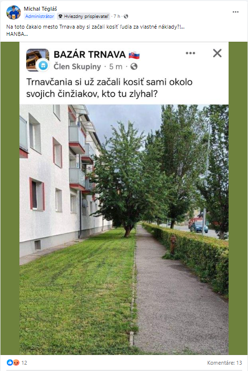Vysoká tráva hnevá v Trnave viacerých obyvateľov mesta, ktorý o tom mnohokrát upozorňujú na rôznych skupinách Trnavy. Niektorí to dokonca vzali do vlastných rúk a trávu si pred bytovkami či domami pokosili sami. V príspevku na to poukázal užívateľ Michal, ktorý zdieľal status z inej skupiny Trnavy. „Na toto čakalo mesto Trnava, aby si začali kosiť ľudia za vlastné náklady?!... HANBA...“ napísal v príspevku Michal.
