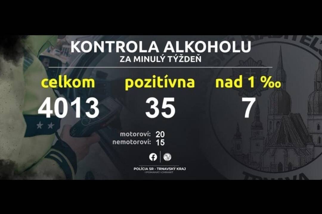 Trnavská polícia na sociálnych sieťach zverejnila štatistiky, ktorými opäť varuje pred rizikami alkoholu za volantom. Napriek opakovaným apelom a preventívnym opatreniam zostáva tento problém stále aktuálny. Policajti v Trnavskom kraji počas uplynulého týždňa vykonali celkovo 4013 dychových skúšok, pričom 35 z nich bolo s pozitívnym výsledkom.