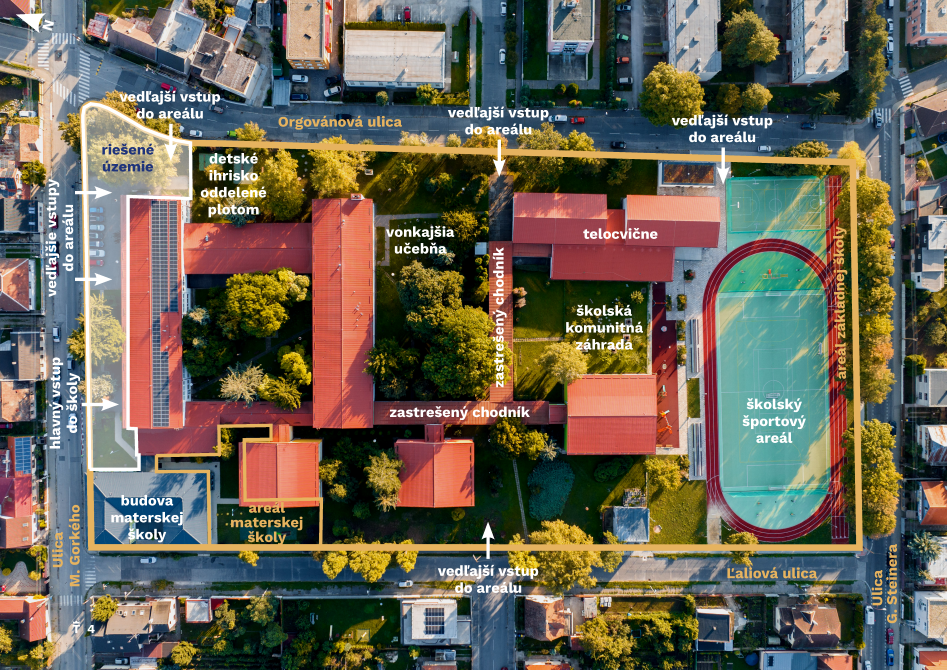 Územie, ktoré sa v budúcej revitalizácii plánuje riešiť, zahŕňa nástupný priestor pred budovou školy na Ulici M. Gorkého, a tiež priľahlé ulice k areálu školy – Ulicu M. Gorkého, Ľaliovú, Orgovánovú a Ulicu G. Steinera.