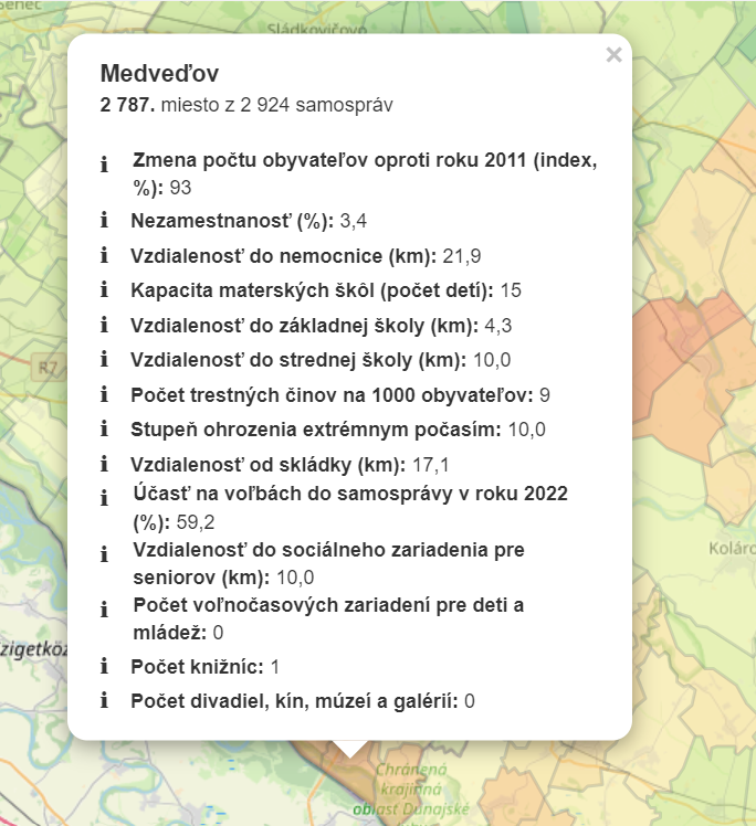 Kvalitu života v mestách a obciach znázorňuje aj interaktívna mapa. Čim je územie obce či mesta viac zelené, tým sa tam lepšie žije a naopak - čím je územie viac červené, tým sa tam žije horšie.