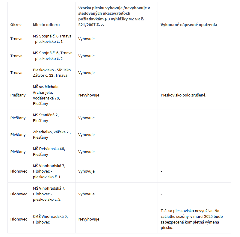 Spolu bolo odobratých 10 vzoriek piesku v meste Trnava, Piešťany a Hlohovec. Osem bolo z pieskovísk pri MŠ a dve z verejných pieskovísk. Laboratórnym rozborom vykonaným RÚVZ bolo zistené, že dve vyšetrované vzorky piesku nevyhovujú v sledovaných ukazovateľoch požiadavkám vyhlášky.