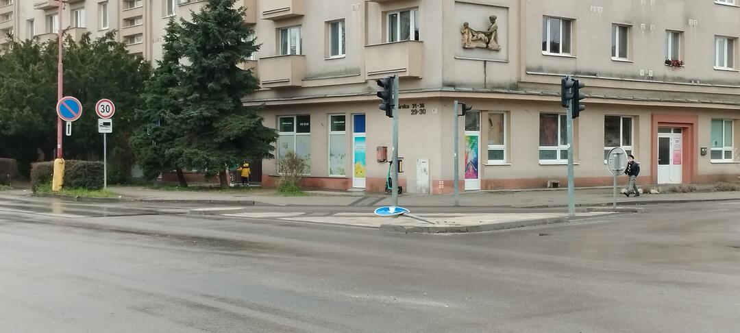 FOTO: Ostrovček na križovatke Hospodárska a Študentská zasahuje do jazdného pruhu. Odniesla si to už dopravná značka