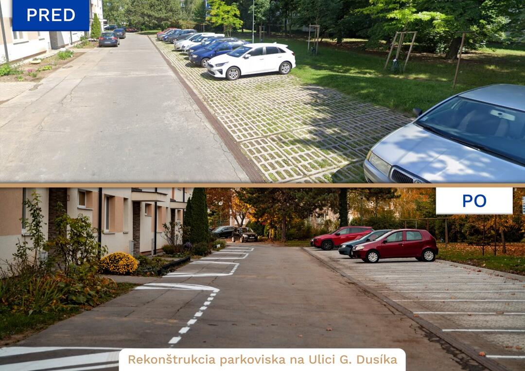 Na Ulici Gejzu Dusíka bolo zrekonštruované parkovisko s 23 kolmými parkovacími miestami pred bytovými domami č. 19 – 23. Na Hospodárskej ulici pred bytovým domom č. 7 – 9 prešla úpravou vnútrobloková cesta, ktorá slúži aj ako chodník, spolu s priľahlými parkovacími miestami.