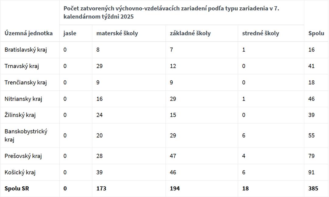 Oproti uplynulému týždňu, kedy bolo zatvorených dokopy 40 škôl je v tomto týždni zatvorených 41 škôl.