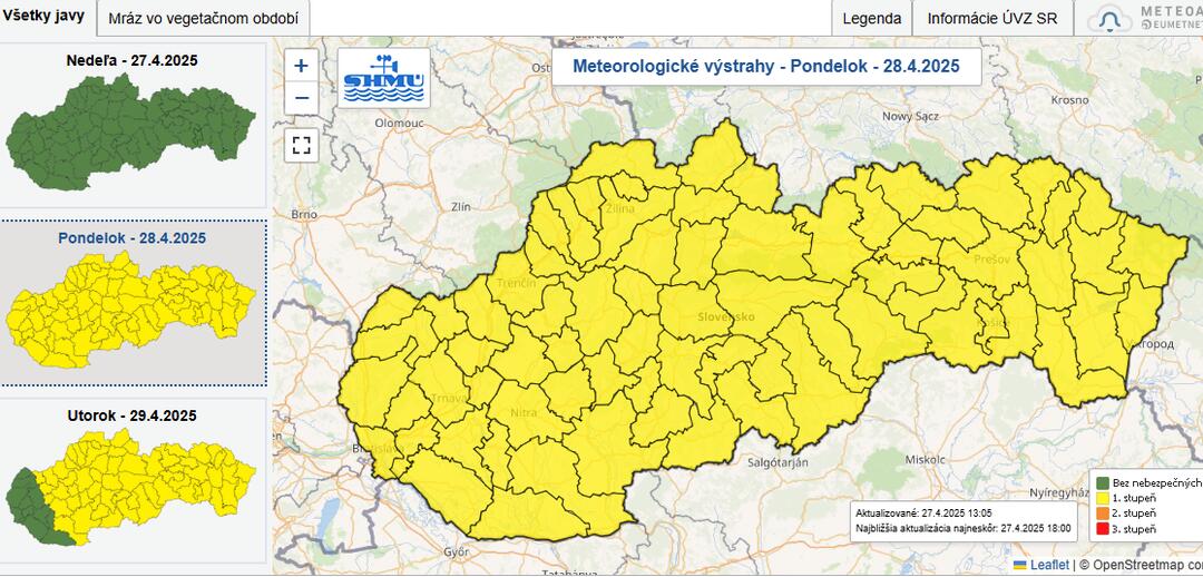 Výstraha 1. stupňa pred mrazom platí z noci od nedele 27. do pondelka 28. apríla 7:00 hod. v každom okrese Trnavského kraja. V okresoch Hlohovec a Piešťany by sa mohli mrazy vyskytnúť aj v noci z pondelka na utorok.