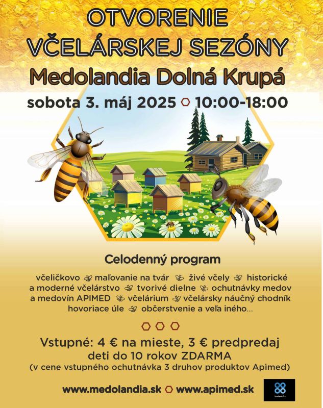 Prvá májová sobota bude v Dolnej Krupej patriť oslave včelárstva a včiel! Pozývame vás na Otvorenie včelárskej sezóny do Medolandie. Podujatie sa uskutoční v zážitkovom areáli Medolandia v Dolnej Krupej, v sobotu 3. mája, program začína o 10:00 hod. a potrvá do 18:00 hod. Na návštevníkov čakajú ochutnávky medov a medovín z Medovinárstva Apimed a bohatý program pre malých i veľkých.