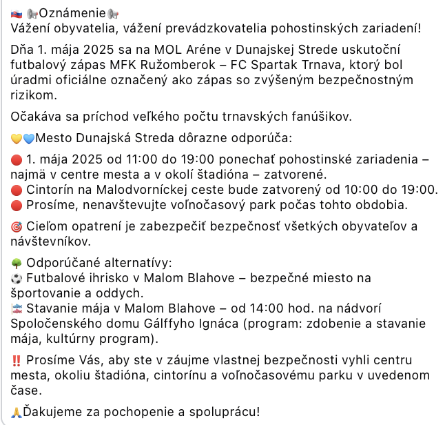 Z futbalového sviatku sa v Dunajskej Strede stáva bezpečnostná operácia, mesto vyzýva ľudí, aby sa 1.mája vyhli centru