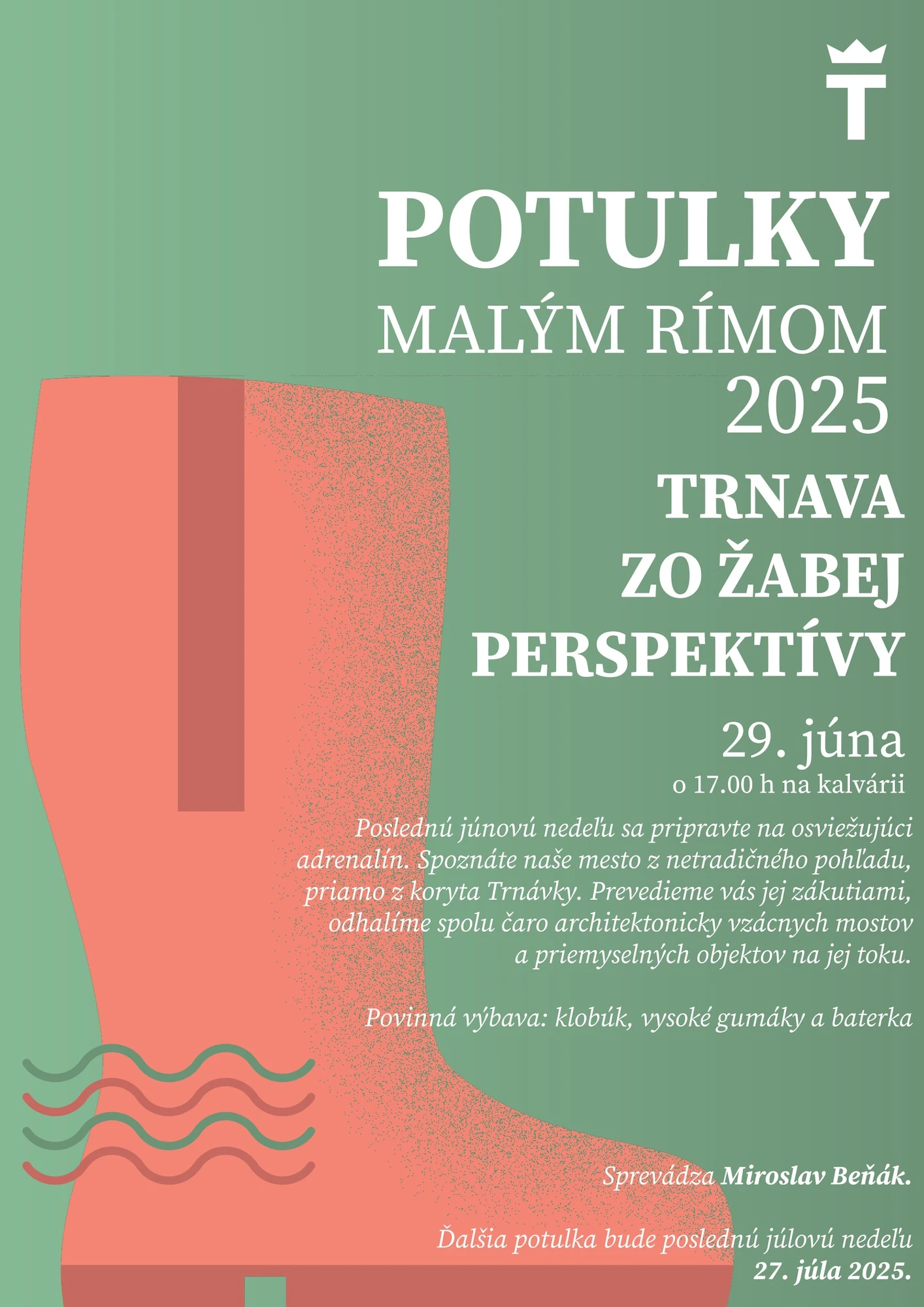 Potulka Malým Rímom s názvom Trnava zo žabej perspektívy sa konala už pred niekoľkými rokmi. Pre jej veľký úspech sa ju mesto rozhodlo opäť zaradiť do svojho repertoáru. Počet vstupeniek je limitovaný, s ich kúpou preto neváhajte.