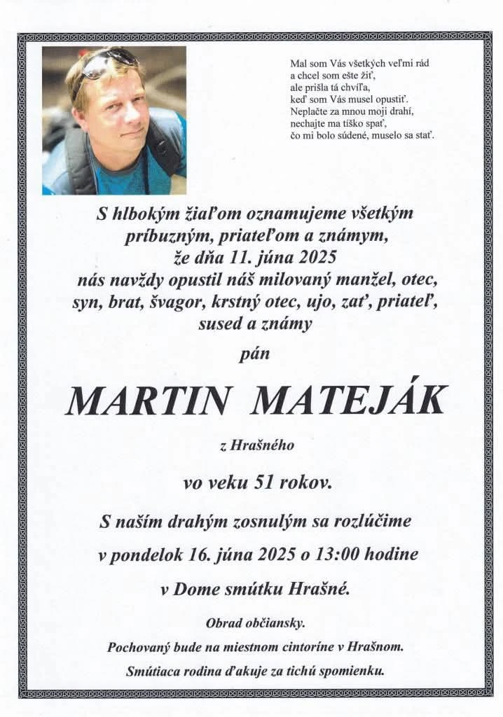 „Dňa 11.6.2025 našu hasičskú rodinu navždy opustil Martin Matejak, veliteľ DHZ Hrašné a člen pléna Územnej organizácie DPO SR Myjava. Česť jeho pamiatke,“ uviedli jeho kolegovia so smútkom v srdci.