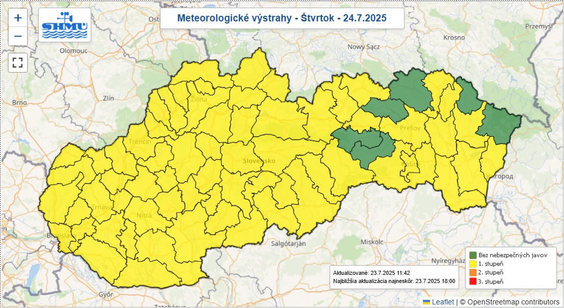 Vo štvrtok meteorológovia predpovedajú zrážky v rozmedzí 20 až 30 milimetrov, pričom búrky môže sprevádzať vietor s rýchlosťou 18 až 23 km/h. Nárazový vietor môže miestami dosiahnuť ešte vyššiu silu, čo zvyšuje riziko padajúcich konárov či poškodenia menších objektov. Výstrahy pred búrkami sú v platnosti od 13. hodiny až do večerných hodín.