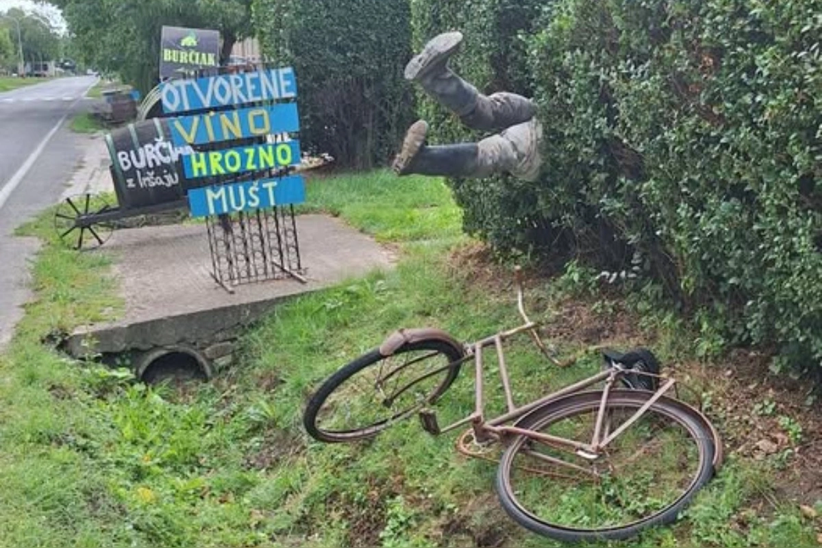 Trnavčanov v týchto dňoch pobavila netradičná reklama vinárstva Dobrý pocit v Ružindole. Pred vinárstvom totiž nečaká len klasická tabuľa s ponukou, ale aj nafingovaná scéna: figurína cyklistu, ktorý nezvládol riadenie a skončil v kríkoch.