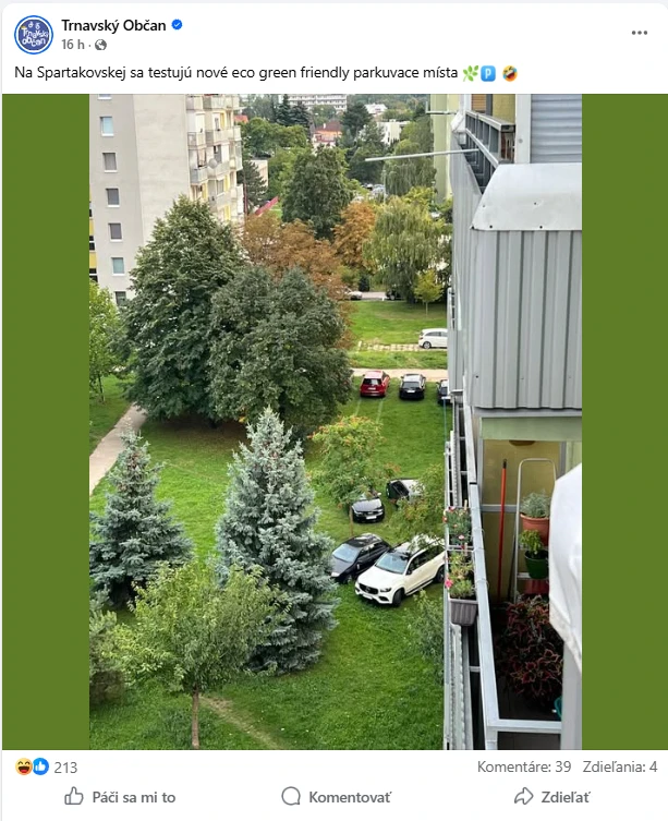 Zverejnená fotografia zachytila niekoľko vozidiel, ktoré sú odstavené na tráve v blízkosti bytových domov. Jej autor to s vtipom okomentoval slovami, že testujú nové ekologické a k životnému prostrediu priateľské parkovacie miesta.
