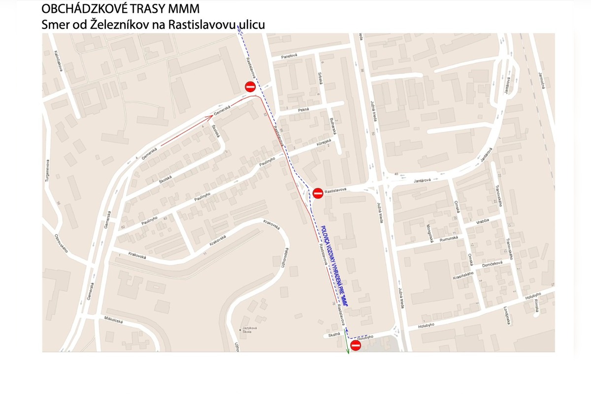 Z Gemerskej ulice budú vozidlá odkláňané na Rastislavovu ulicu smerom na Juh. V protismere od Holubyho ulice pobežia účastníci podujatia.