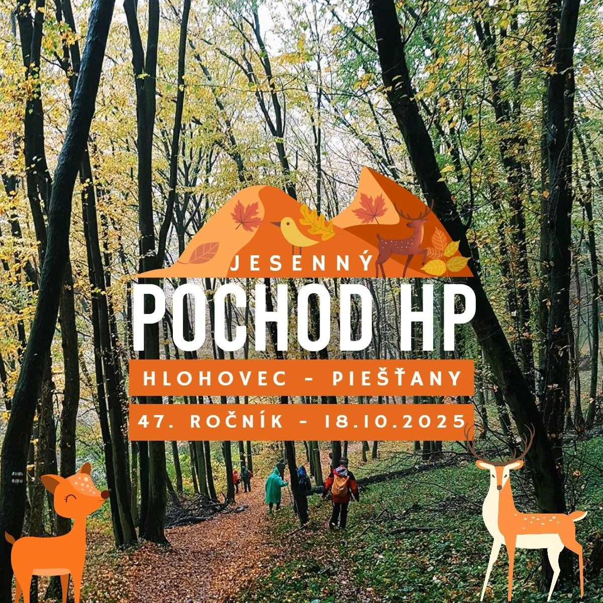 V Hlohovci uskutoční 47. ročník Jesenného HPčka, obľúbeného turistického podujatia, ktoré každoročne priláka stovky milovníkov prírody. Účastníci sa môžu tešiť na farebné jesenné lesy, čerstvý vzduch a tradične výbornú atmosféru. Štart bude prebiehať od 7:00 do 9:00 hod. na železničnej stanici v Hlohovci.