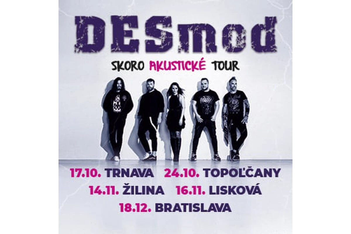 Kapela DESmod sa na jeseň 2025 vracia na pódia s novou sériou koncertov Skoro akustické tour. Trnavčania sa môžu tešiť na vystúpenie 17. októbra o 20:00 v Kine Hviezda. Skupina predstaví svoje známe hity v komornejšej, akustickej podobe, ktorá odhalí ich jemnejšiu stránku, no zachová typickú energiu. Fanúšikov čaká príjemná atmosféra, spontánne momenty a nový pohľad na hudbu DESmod.