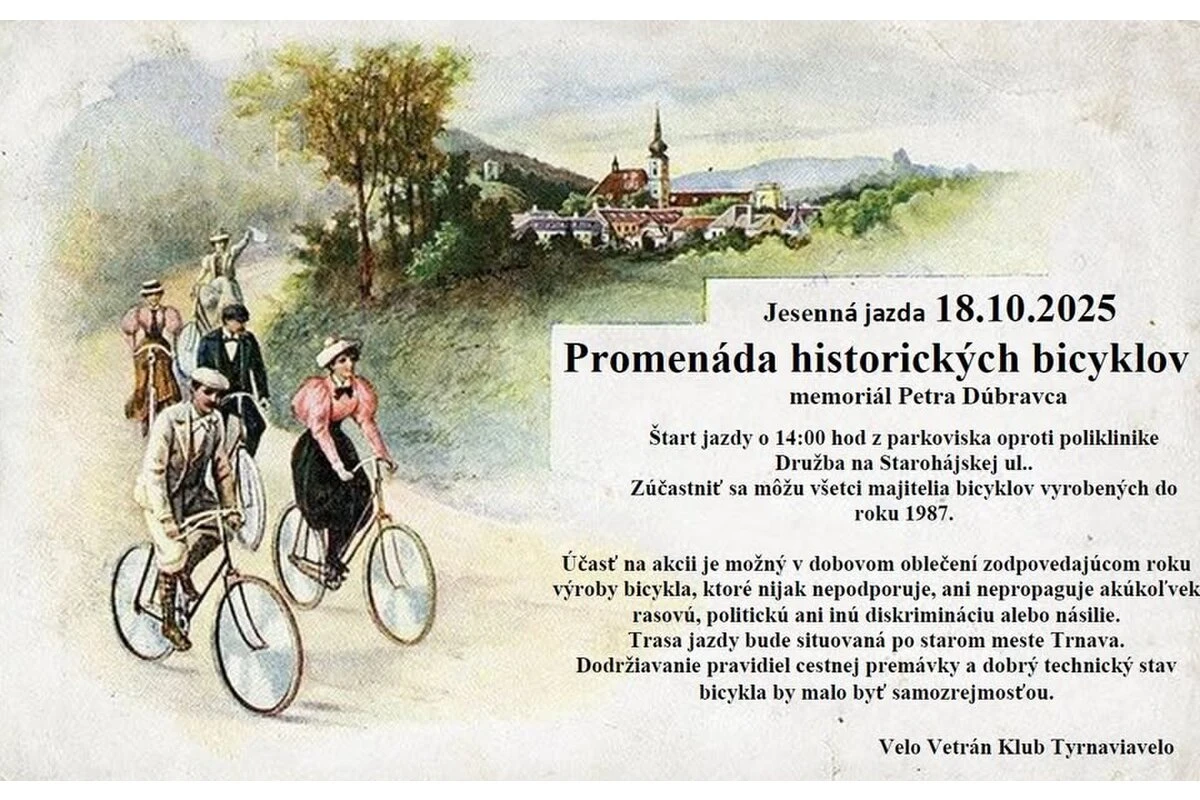 Trnavou opäť prejde Promenáda historických bicyklov – Jesenná jazda, venovaná pamiatke Petra Dúbravca. Podujatie organizuje Velo Vetrán Klub Tyrnaviavelo a začne sa o 14:00 na parkovisku oproti poliklinike Družba na Starohájskej ulici. Do jazdy sa môžu zapojiť všetci majitelia bicyklov vyrobených do roku 1987, ideálne v dobovom oblečení zodpovedajúcom ére ich bicykla. Trasa povedie uličkami historického centra Trnavy a prinesie jedinečnú atmosféru minulých čias i poctu cyklistickému dedičstvu. Odevy by mali byť zvolené s rešpektom – bez symbolov diskriminácie, násilia či politických ideológií.