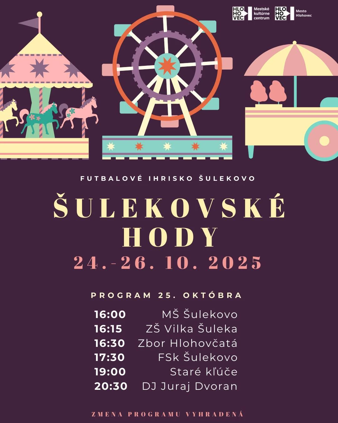 Kde: na futbalovom ihrisku v ŠulekoveV Šulekove sa uskutočnia tradičné Šulekoveské hody 2025 a návštevníkom prinesú víkend plný tradícií, hudby, tanca, dobrej nálady a nezabudnuteľných zážitkov. Čakajú tu kolotoče, stánky s občerstvením, atrakcie pre deti aj dospelých a bohatý kultúrny program, pričom v sobotu 25. októbra sa predstaví MŠ Šulekovo, ZŠ Vilka Šuleka, Zbor Hlohovčatá, FSk Šulekovo, kapela Staré kľúče a večer program uzavrie DJ Juraj Dvoran.