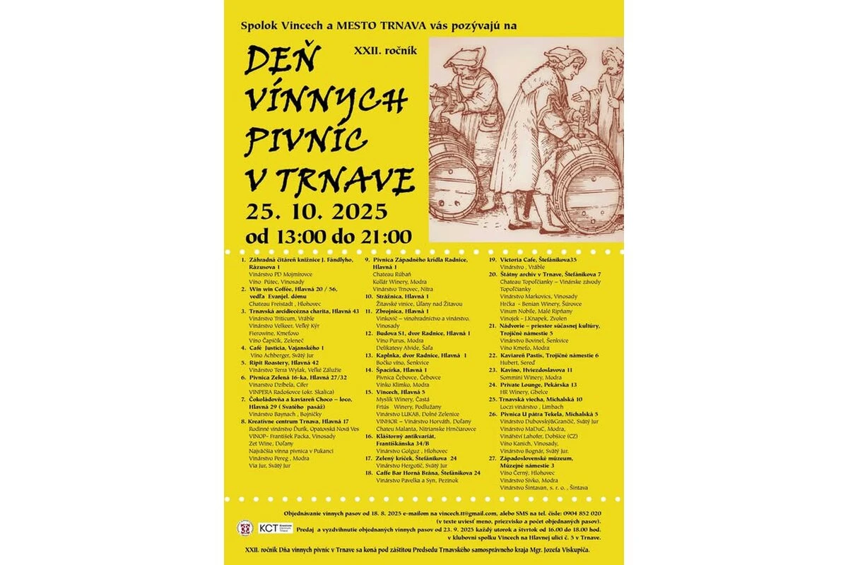 Historické pivnice v centre Trnavy sa v sobotu 25. októbra otvoria milovníkom vína na 22. ročníku Dňa vínnych pivníc, kde návštevníci ochutnajú desiatky vín od približne päťdesiatich vinárov zo Slovenska a Moravy. Vstupenky vo forme vínnych pasov umožnia ochutnávku vo viac ako tridsiatich pivniciach, pričom cena 30 eur zahŕňa aj bonus na nákup vína. Väčšina vinárov pochádza z Malokarpatskej oblasti, zvyšok z iných regiónov Slovenska a Moravy. Okrem vína lákajú aj historické pivnice, medzi najstaršie patrí pivnica Čajka či pivnica na začiatku Františkánskej ulice. Podujatie je veľmi obľúbené a všetky vínne pasy sa často vypredajú ešte pred začiatkom.