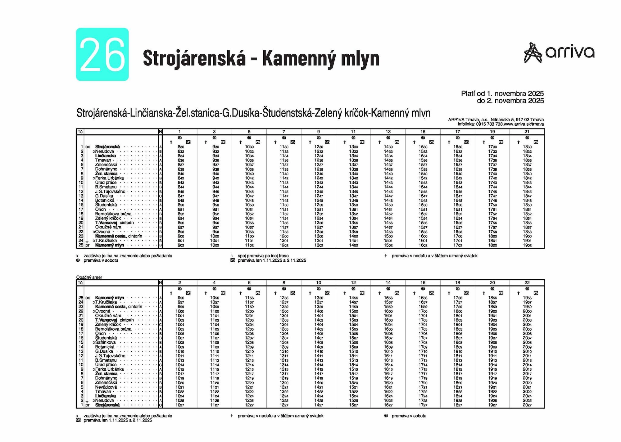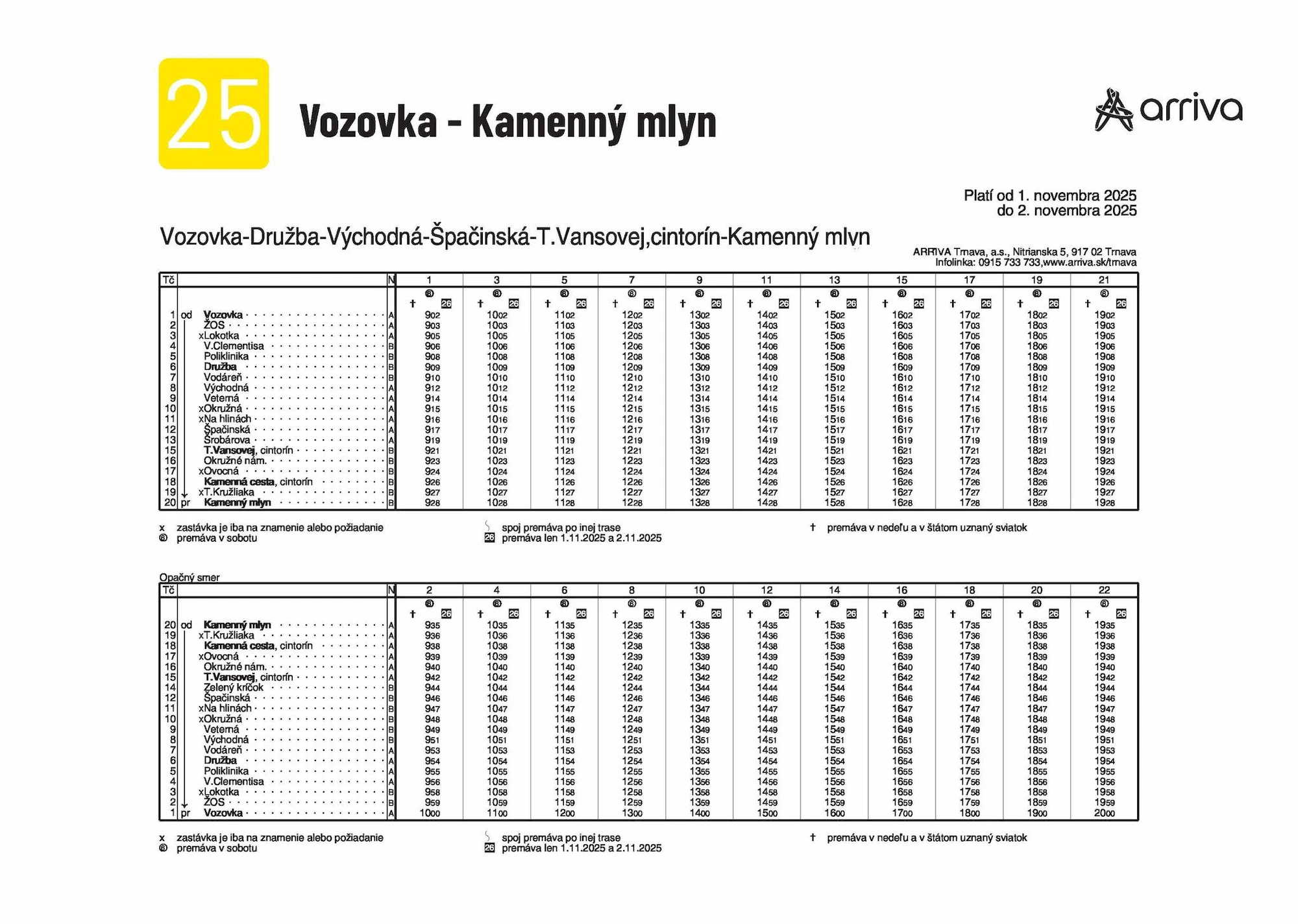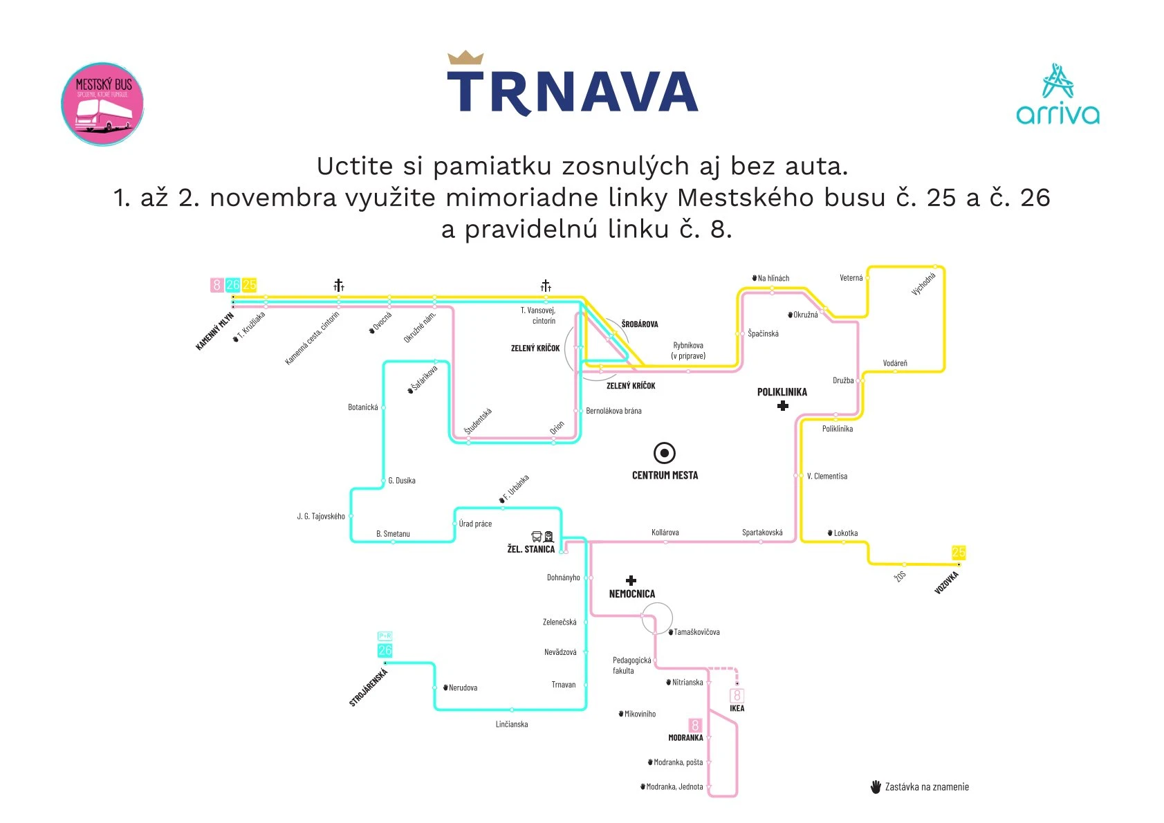Počas 1. a 2. novembra budú premávať špeciálne linky č. 25 a č. 26, ktoré zastavia pri všetkých hlavných vstupoch na cintoríny. Linky jazdia v hodinovom intervale od dopoludnia do podvečera, takže sa nemusíte obávať, že by ste museli dlho čakať.