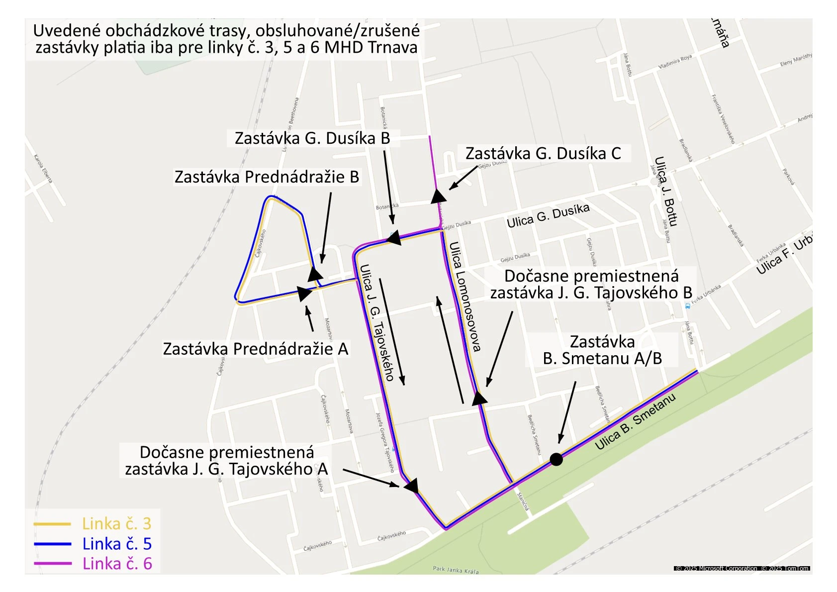 Obchádzková trasa pre osobnú dopravu povedie cez Ulicu Bedřicha Smetanu a Lomonosovovu.