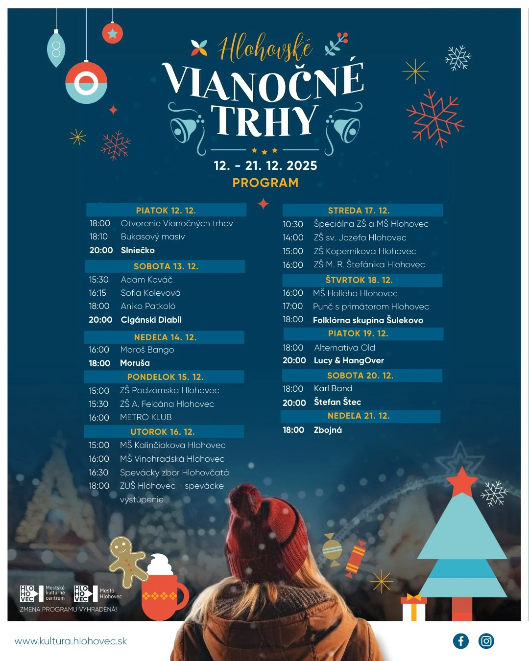 Počas deviatich dní sa na pódiu vystrieda množstvo interpretov a skupín z Hlohovca aj okolia. V sobotu 13. decembra sa predstavia Adam Kováč, Sofia Keleová a Anika Patkoló, večer rozprúdia náladu Cigánski Diabli.