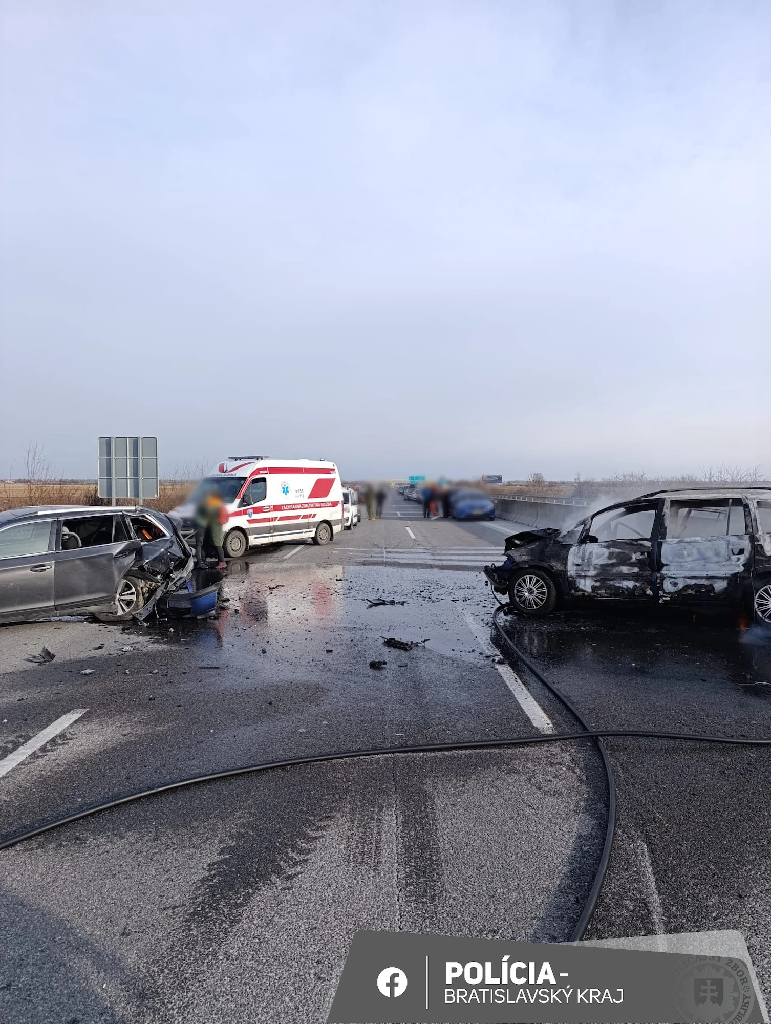 Na diaľnici D1 za výjazdom Senec - východ smerom na Bratislavu sa zrazili dve autá. V tomto úseku dopravní policajti Krajského riaditeľstva PZ v Bratislave vykonávajú potrebné úkony, o čom informovali na sociálnej sieti.