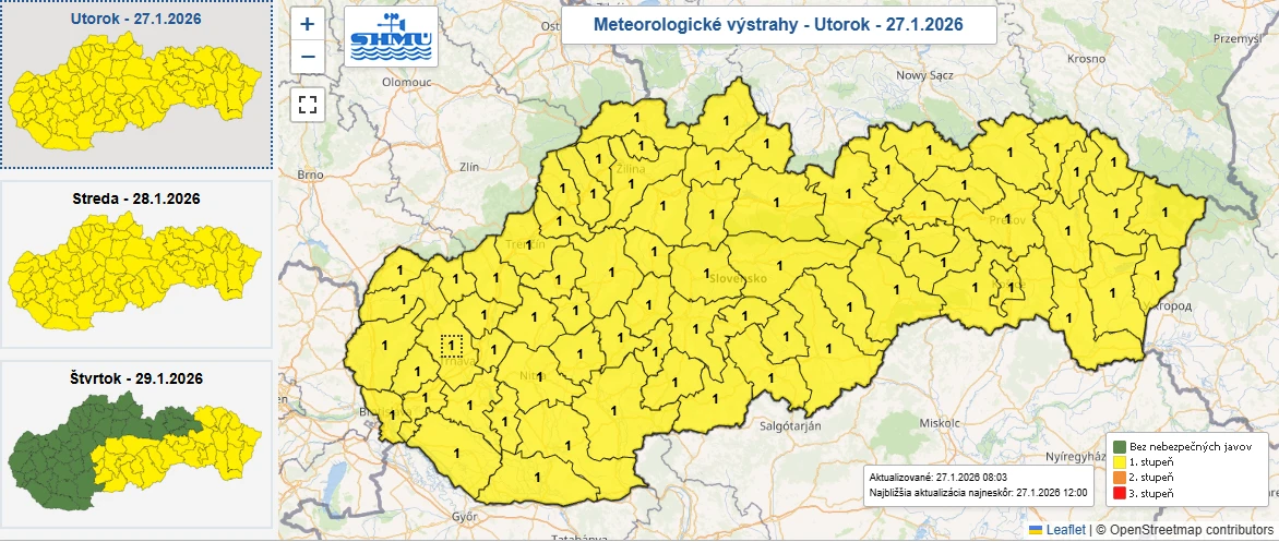 V utorok od 7:50 do 12:00 hod. sa môže ojedinele tvoriť aj poľadovica. Klzké cesty a chodníky môžu skomplikovať rannú premávku aj pohyb chodcov. Hoci je tvorba poľadovice v tomto období bežná, môže spôsobiť menšie škody či dopravné nehody.
