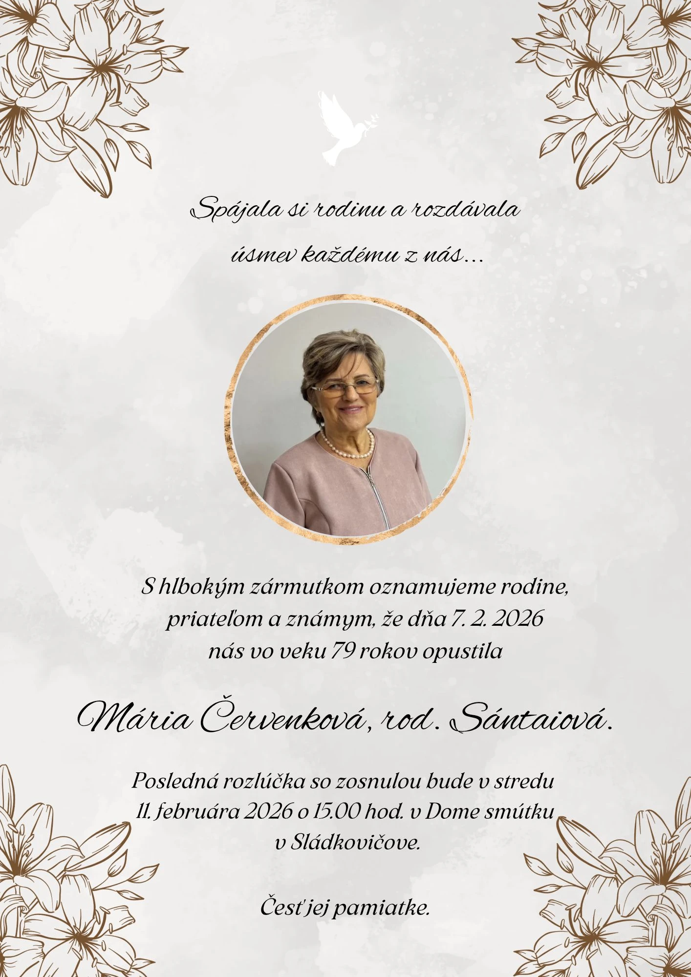 Sládkovičovo zasiahla smutná správa o úmrtí dlhoročnej učiteľky, pani Márii Červenkovej, ktorá zomrela 7. februára vo veku 79 rokov. Jej odchod hlboko zasiahol mnohých obyvateľov mesta, ktorí ju dobre poznali.