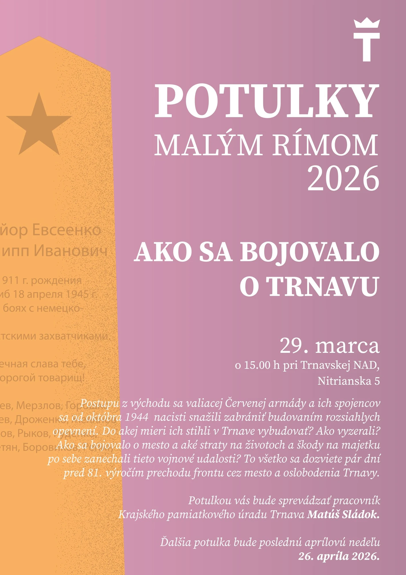 Koncom marca sa bude konať ďalšia potulka mestom. Návštevníkov zavedie do čias oslobodenia Trnavy
