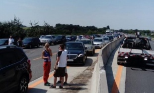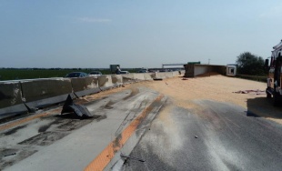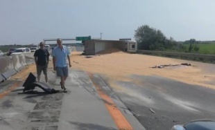 Na D1 v smere z Bratislavy do Trnavy sa prevrátil kamión s kukuricou, nehoda ochromila dopravu