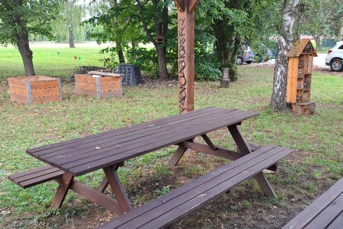 Posedenie, ktoré vybudovali dobrovoľníci v Trnave pre autistov, niekto poškodil. Vandali na stole zanechali odkaz
